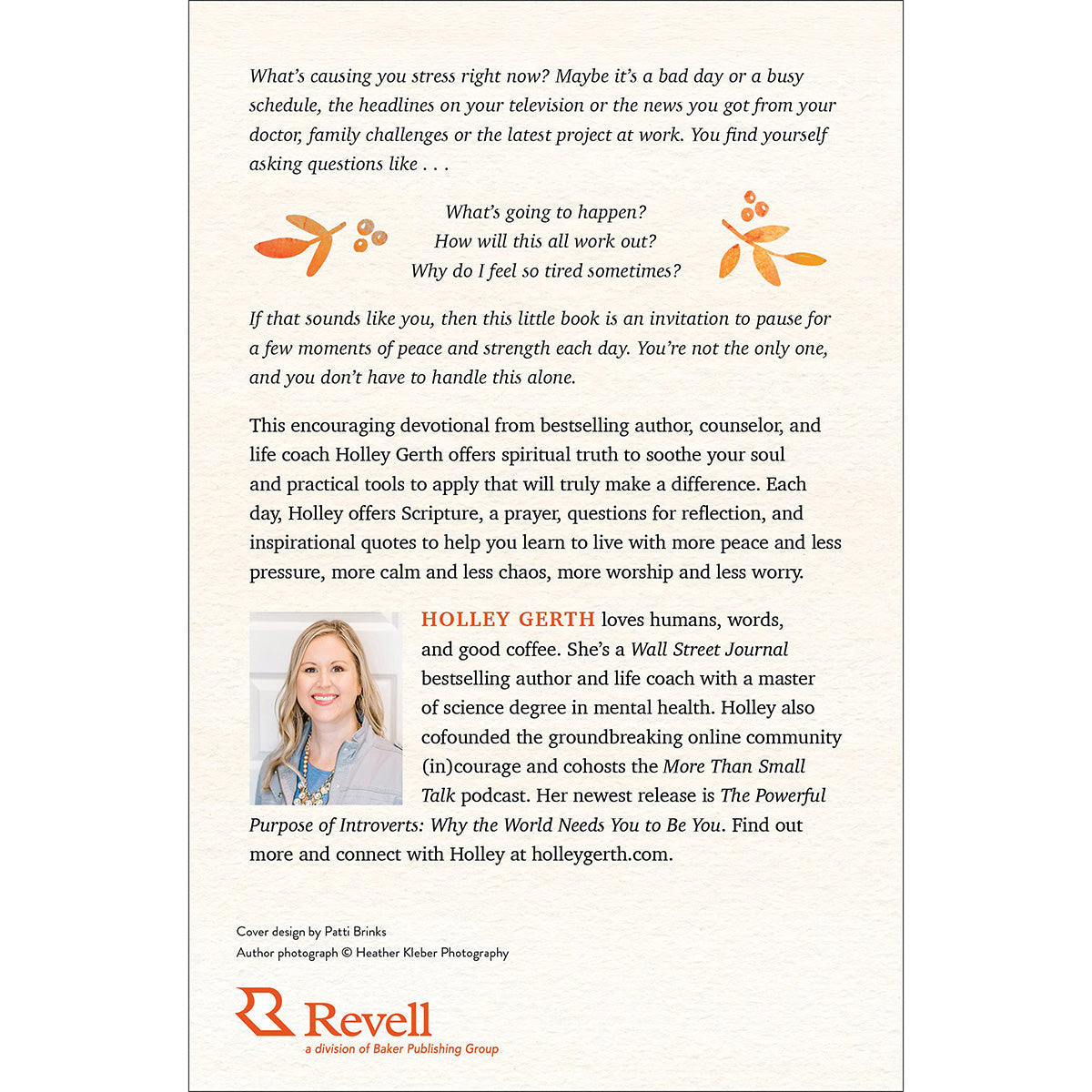 Stress is inevitable, but letting it control your life is optional. As a bestselling author, counselor, and life coach, Holley Gerth has learned a lot about dealing with stress and what truly helps. What Your Soul Needs for Stressful Times is your invitation to pause for a few moments of encouragement, peace, and strength each day. This 60-day devotional offers spiritual truth to soothe your soul alongside practical tools to apply that will truly make a difference. Each day, Holley offers Scripture, a prayer, questions for reflection, and inspirational quotes to help you learn to live with more peace and less pressure, more calm and less chaos, more worship and less worry.